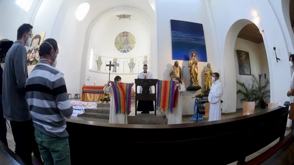 Baptisé "L'Amour gagne", ce mouvement de protestation des prêtres est d'une ampleur inédite au sein de l'église catholique allemande. Les drapeaux arc-en-ciel fleurissent sur les façades des lieux de culte ou bien, comme à Brunswick, posés au sol au pied de l'autel de cette église dominicaine de Saint Albertus Magnus, où le prieur Hans-Albert Gunk a été l'un des premiers, samedi après-midi, à bénir des unions homosexuelles.