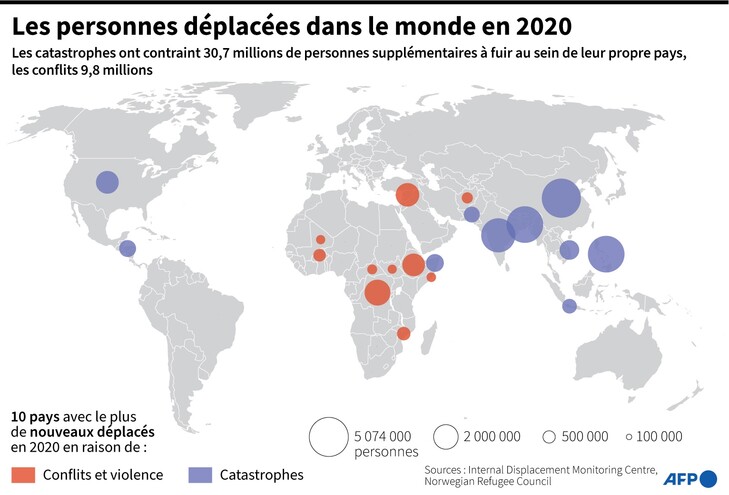 Malgré les restrictions aux déplacements liées à la pandémie de Covid-19, 40,5 millions de personnes sont venues grossir les rangs des déplacés internes, le plus grand nombre depuis dix ans, ont souligné les ONG. « Ces deux nombres ont été inhabituellement élevés », a expliqué Alexandra Bilak, la directrice de l'IDMC à l'Agence France-Presse (AFP), estimant que cette poussée est « sans précédent ».
