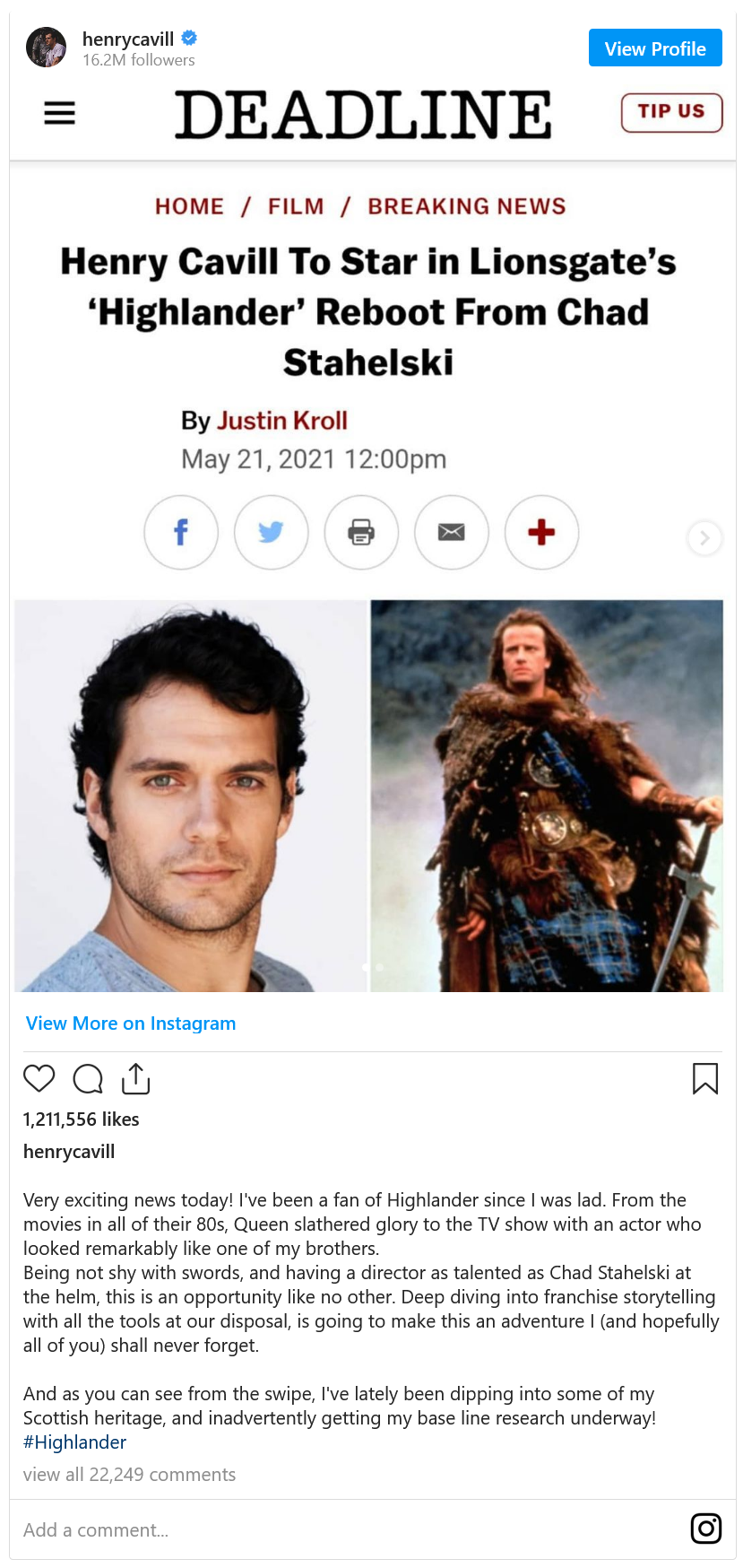 L'information vient du site Deadline, qui annonce que l'acteur serait la priorité de Lionsgate, peut-être pour reprendre le personnage de MacLeod, joué par Christophe Lambert, plus de 30 ans plus tôt. L'acteur de 38 ans a même manifesté son appréciation via ce post Instagram, en louant l'univers d'Highlander. Cependant l'information n'a pas été validée par le studio. On sait néanmoins que ce sera Chad Stahelski (John Wick) qui sera aux manettes du film.