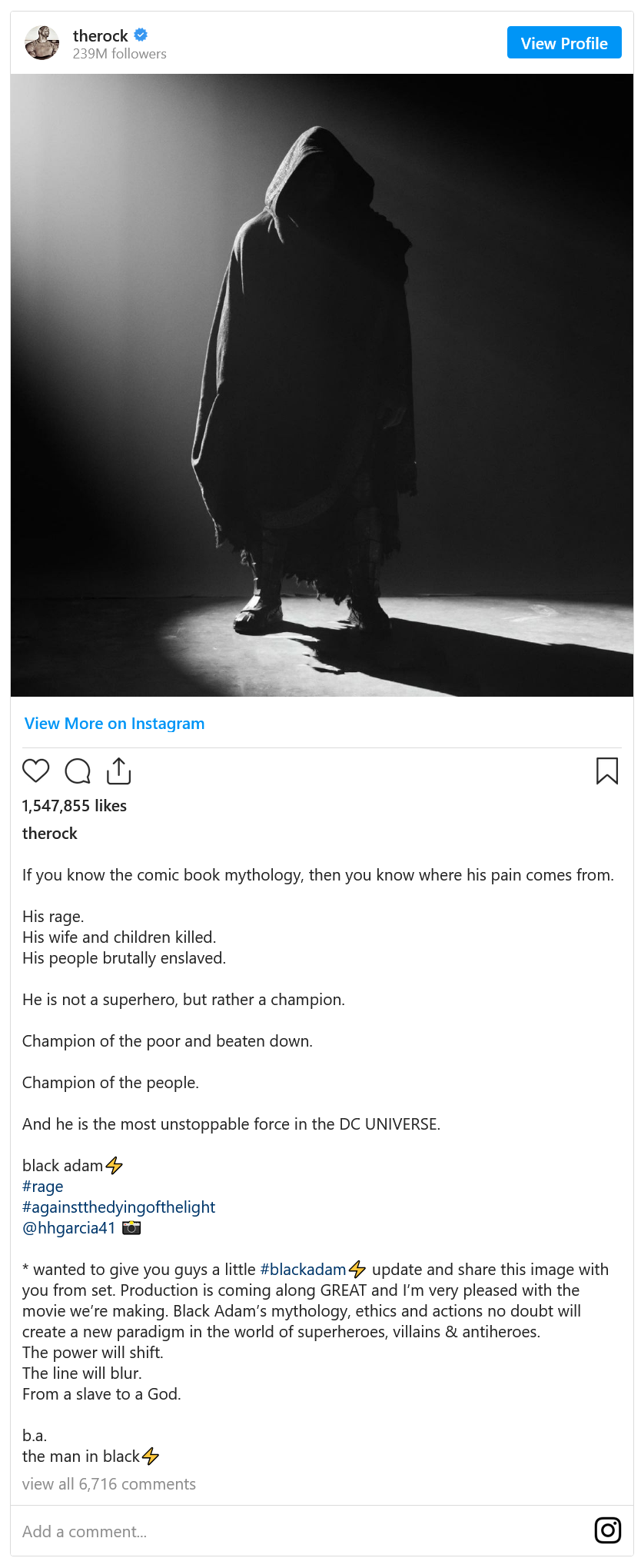 Je voulais vous donner une petite mise à jour #blackadam et partager cette image avec vous depuis le plateau. La production avance à merveille et je suis très satisfait du film que nous sommes en train de réaliser. La mythologie, l'éthique et les actions de Black Adam créeront sans aucun doute un nouveau paradigme dans le monde des super-héros, des méchants et des anti-héros. Le pouvoir changera. La ligne sera floue. D'un esclave à un Dieu.