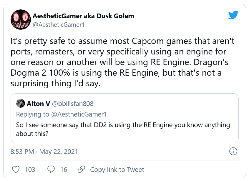 On peut dire sans trop se tromper que la plupart des jeux Capcom qui ne sont pas des portages, remakes ou qui utilisent très spécifiquement un moteur de jeu pour une raison ou une autre utiliseront le moteur de Resident Evil. Dragon's Dogma 2 utilise à 100% le moteur de Resident Evil, mais ce n'est pas chose surprenante selon moi.