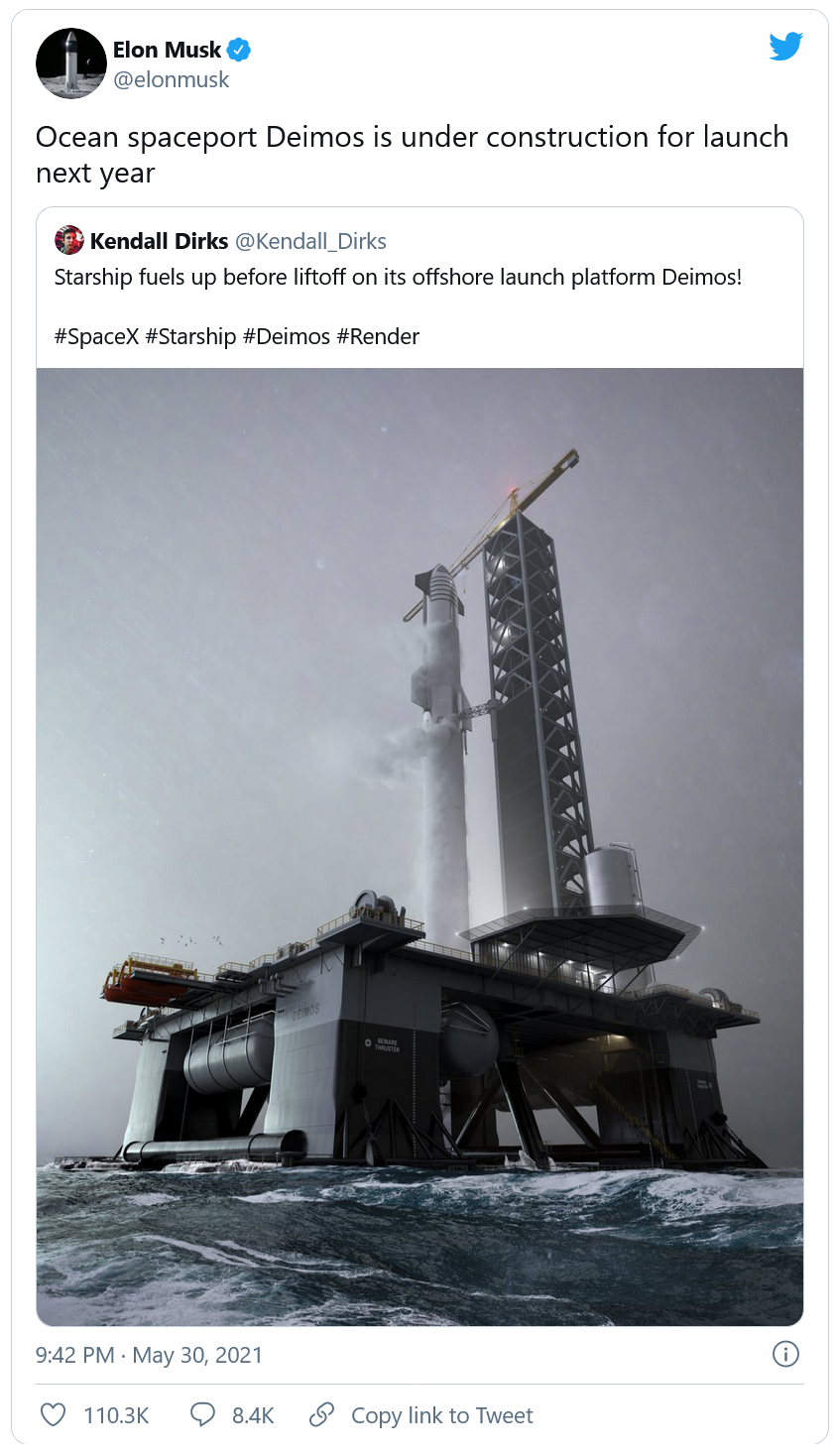 SpaceX a déjà réussi la prouesse de pouvoir faire atterrir des fusées (les Falcon 9, en l'occurrence) sur des barges, en procédant à la récupération du premier étage des lanceurs. Elon Musk pourrait aller plus loin, en faisant décoller ces dernières depuis des plateformes flottantes, comme indiqué dans une récente publication sur le réseau social Twitter :