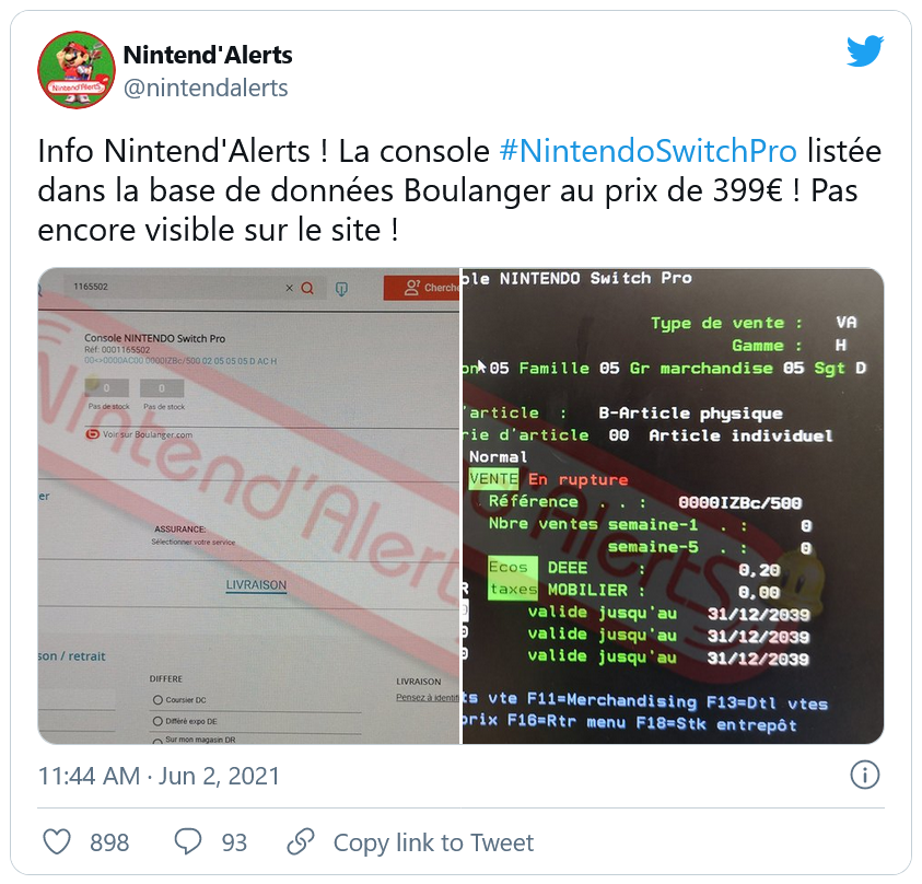 C'est au compte Twitter Nintend'Alerts à qui l'on doit cette fuite. En effet, à l'aide de photographies de la base de donnés Boulanger, l'enseigne High-Tech se serait déjà préparée à accueillir la console dans ses stocks, tout en révélant son prix. On s'en doutait un peu, mais le prix est supérieur à celui de la Switch actuelle, qui est au prix de 299 €.