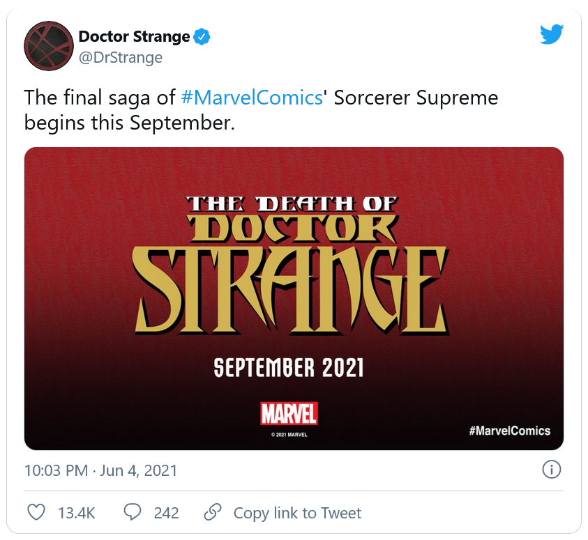 Marvel a récemment publié un teaser du prochain arc narratif consacré à Stephen Strange. Celle-ci s'intitule sobrement "The Death of Doctor Strange" et devrait être publiée d'ici septembre 2021. Malheureusement pour nous, le seul texte d'information accompagnant ce teaser est le suivant : "The Final saga of Marvel's Sorcerer Supreme begins this September." (traduisez : La saga finale du sorcier suprême de Marvel commence en septembre" )
