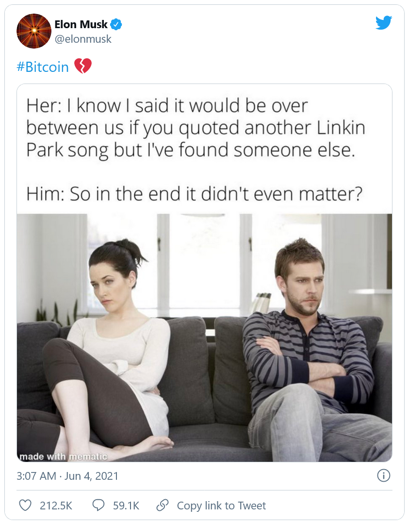 Cependant, l'initiateur de la vidéo a tenu à nuancer la vidéo, et rappelle qu'il est de la responsabilité de chacun d'investir avec prudence dans ces monnaies virtuelles à cause de leur valeur extrêmement volatile. Néanmoins, les tweets d'Elon Musk, notamment avec l'arrêt du paiement en bitcoin pour les Tesla, ont effectivement bien souvent bousculé la valeur. Récemment, un simple tweet avec un cœur brisé en rapport avec la monnaie virtuelle a provoqué une nouvelle chute de 8%.
