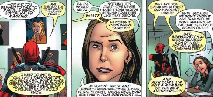 Le rythme s'accélère lorsque certaines actions de Deadpool impliquent une destruction concrète du quatrième mur, comme lorsqu'il s'est échappé de la timeline de Marvel pour menacer ses propres créateurs, ou lorsqu'il s'est accordé le petit plaisir de tuer quelques personnages de la littérature classique. Un vrai coquin ! Autre exemple, dans le numéro 37 de Deadpool, nous retrouvons Loki essayant de convaincre l'anti-héros qu'ils sont tous les deux impliqués dans une machination des plus alambiquées. Pendant l'échange, Loki confirme à Deadpool qu'il est véritablement enfermé dans un monde fictionnel.