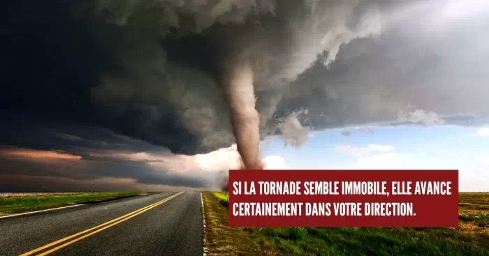 Si vous vous trouvez confronté à une tornade et que celle-ci ne semble pas bouger du tout, c'est qu'elle est très certainement entrain d'avancer dangereusement OU de s'éloigner de vous. Dans le doute, mieux vaut fuir le plus vite possible : une fois pris dans la tornade, il sera trop tard pour regretter !