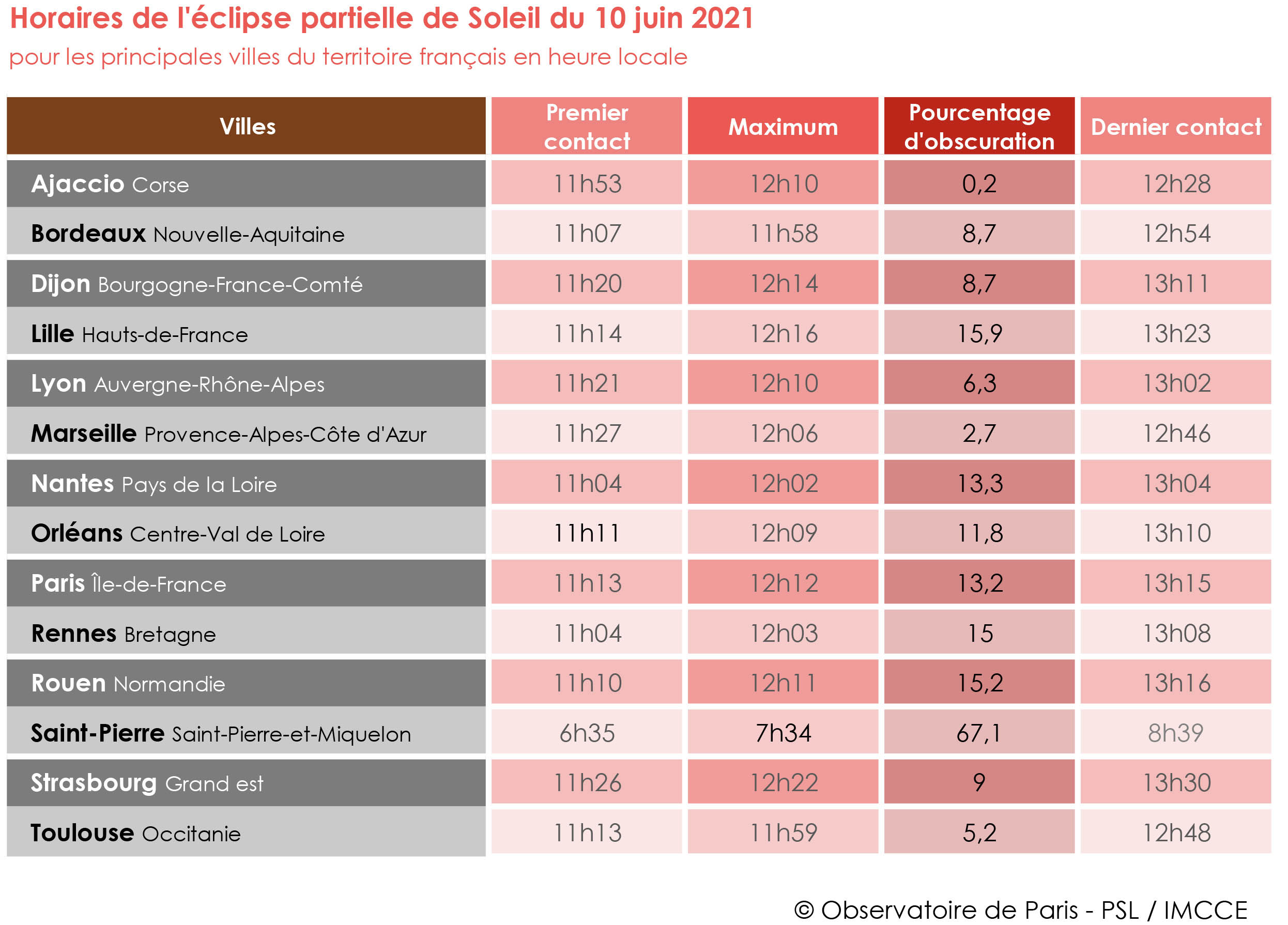 Lorsque le Soleil rencontre la Lune, le spectacle est toujours beau à voir. Cette dernière, qui se présentera malicieusement entre la Terre et notre astre solaire, permettra d'observer un bel anneau de feu. Pour information, la dernière éclipse partielle de Soleil observable en France remonte au 20 mars 2015. Cette année, elle sera observable à son maximum entre 11h55 et 12h20 selon l'endroit où vous vous trouvez. L'Observatoire de Paris a réalisé un tableau comparatif (voir photo ci-dessous) qui vous permettra de savoir quand exactement vous pourrez observer le phénomène. Les habitants de certains territoires sont mieux lotis que d'autres, à l'image de ceux de Saint-Pierre et Miquelon, qui pourront bénéficier de 67% d'obscuration du disque solaire.
