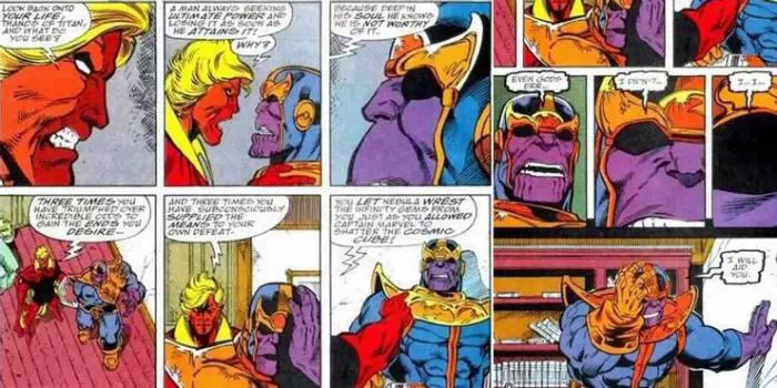 Lors d'un passage, Adam Warlock demande au départ l'aide du titan fou pour l'aider à faire tomber sa fille, Nebula, qui a acquis le gant de l'infini. Thanos refuse, et c'est là que Warlock annonce qu'il connaît mieux Thanos que quiconque, en raison de son temps passé avec les pierres d'infinité. Il voit en effet à travers lui un échec, un titan qui gagne le pouvoir ultime de l'univers et qui le perd dès qu'il est proche de la victoire finale. Au fond de son âme, il sait qu'il n'est pas digne de ce pouvoir.