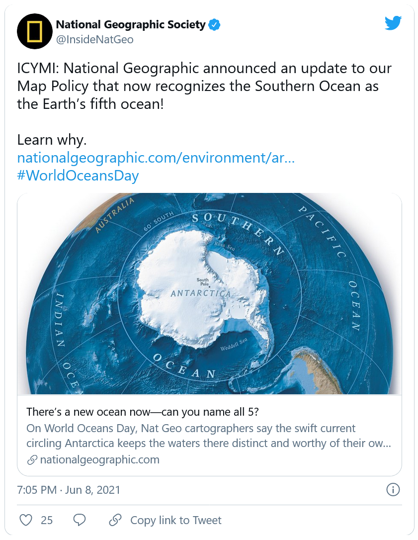 Au cas où vous l'auriez manqué : National Geographic a annoncé une mise à jour de notre carte du monde qui reconnaît désormais l'océan Austral comme le cinquième océan de la Terre !