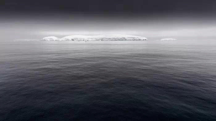 Photographie de Jasper Joest, Nat Geo Image Collection. Elle représente le détroit de Gerlache, situé au large de la côte ouest de la péninsule Antarctique. Il était autrefois admis qu'il faisait partie du Pacifique, mais intègre depuis le 8 juin 2021 - journée mondiale des océans, un choix symbolique - l'océan Austral.