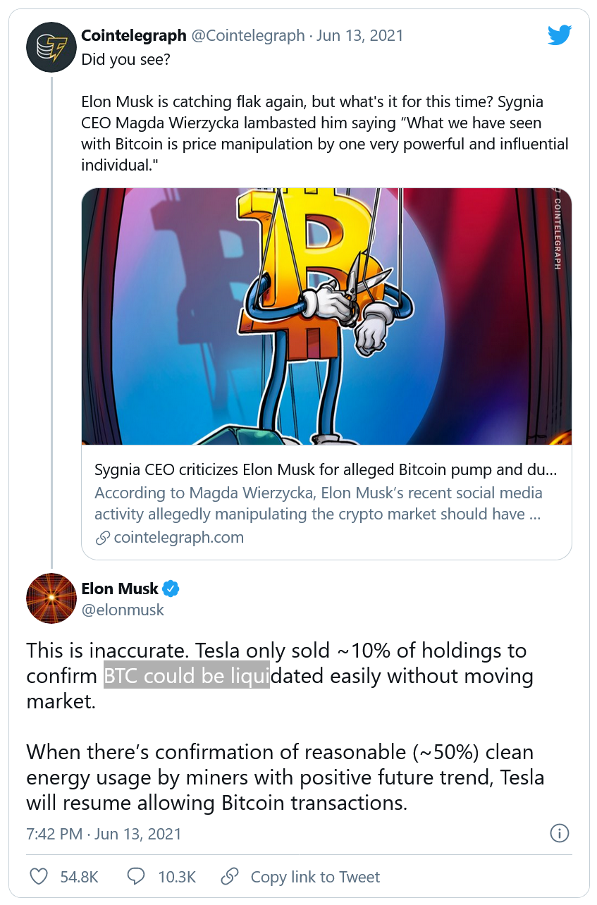 Quand il y aura confirmation de l'utilisation raisonnable (~50%) de l'énergie propre par les mineurs avec une tendance future positive, Tesla va reprendre les transactions en Bitcoin.