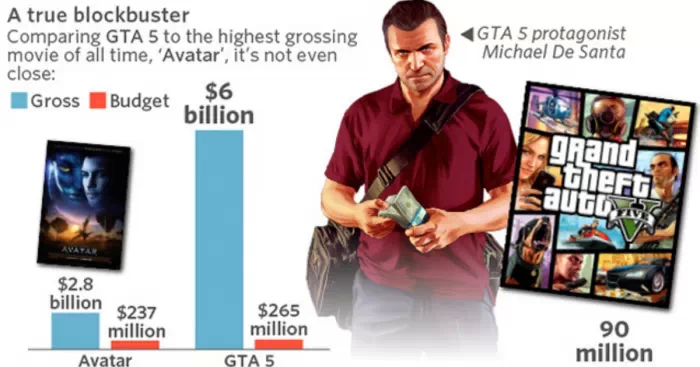 Ainsi, si on prend l'exemple du film Avatar de James Cameron, celui-ci n'a rapporté que 2,8 milliards, creusant un écart de 3,2 milliards de dollars avec GTA V.