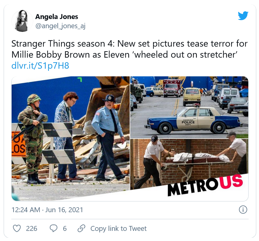Et les choses risquent de tourner à la catastrophe, du moins pour Eleven, incarnée par Millie Bobby Brown. Effectivement, on peut voir sur ces images que son personnage est blessé puisqu'elle est attachée à une civière et poussée par deux secouristes en direction d'une ambulance. L'avenir pour Eleven semble sombre puisque elle est enveloppée d'un drap blanc et d'autres photos du site montrent des militaires et policiers dans une rue dévastée et un véhicule des forces de l'ordre barrer une route.
