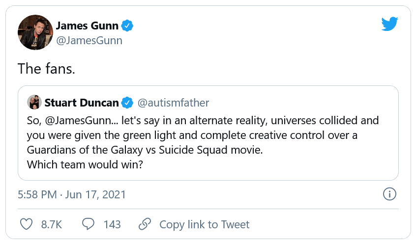 Toujours présent sur Twitter et dans l'art du teasing, James Gunn a récemment répondu à un fan après un tweet sur un éventuel crossover entre Marvel et DC. Dans ce dernier post, Gunn a révélé qu'il en avait en réalité déjà parlé aux dirigeants des deux studios, pour un croisement entre deux univers précis : celui de Suicide Squad et Les Gardiens de la Galaxie.