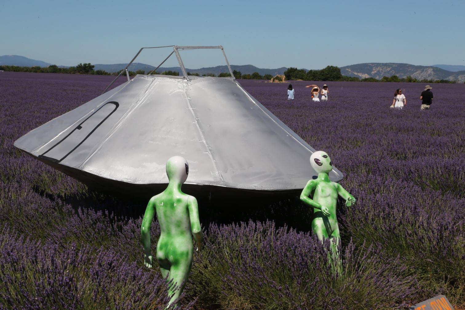 Une réplique d'une soucoupe volante installée dans le champ de lavandes dans les Alpes-de-Haute-Provence.