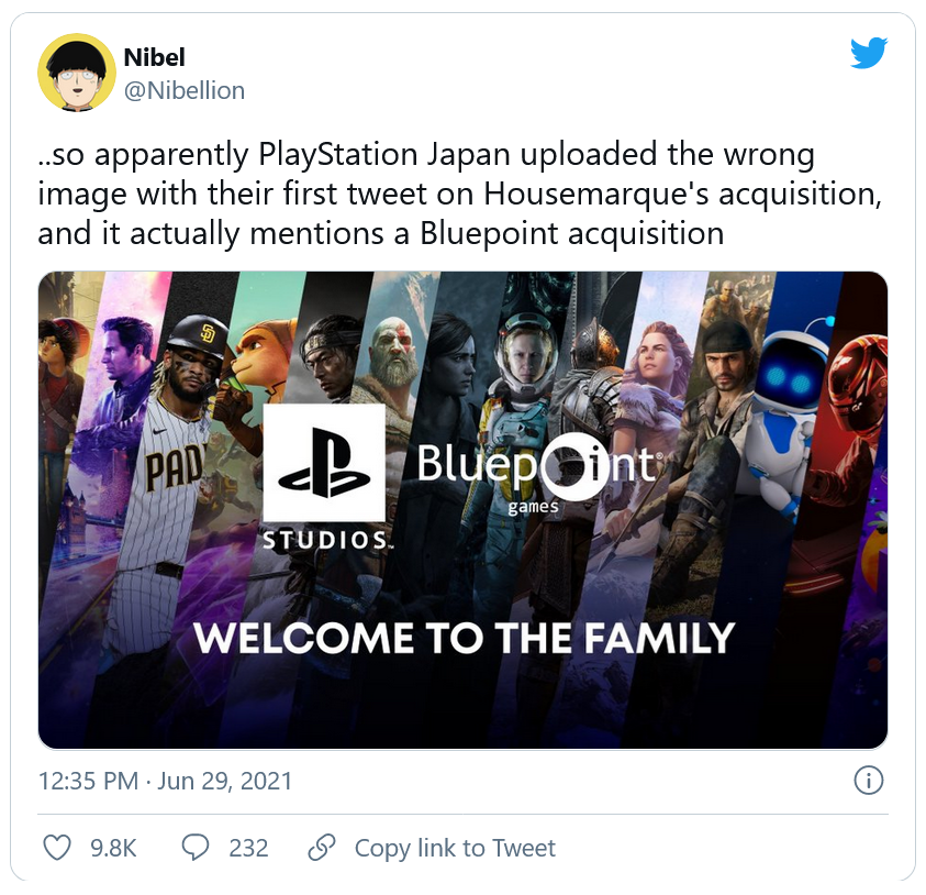 Mais dans son engouement, la firme japonaise a semble t-il commis une bévue. Suite au rachat, sur le compte Twitter japonais du constructeur, on pouvait remarquer un visuel frappé des licences estampillées Sony, le logo de Playstation Studios, et... non pas le logo de Housemarque, mais celui de Bluepoint Games. Si le tweet a été supprimé dans la foulée, la bourde n'a échappé à personne, en témoigne ce visuel.