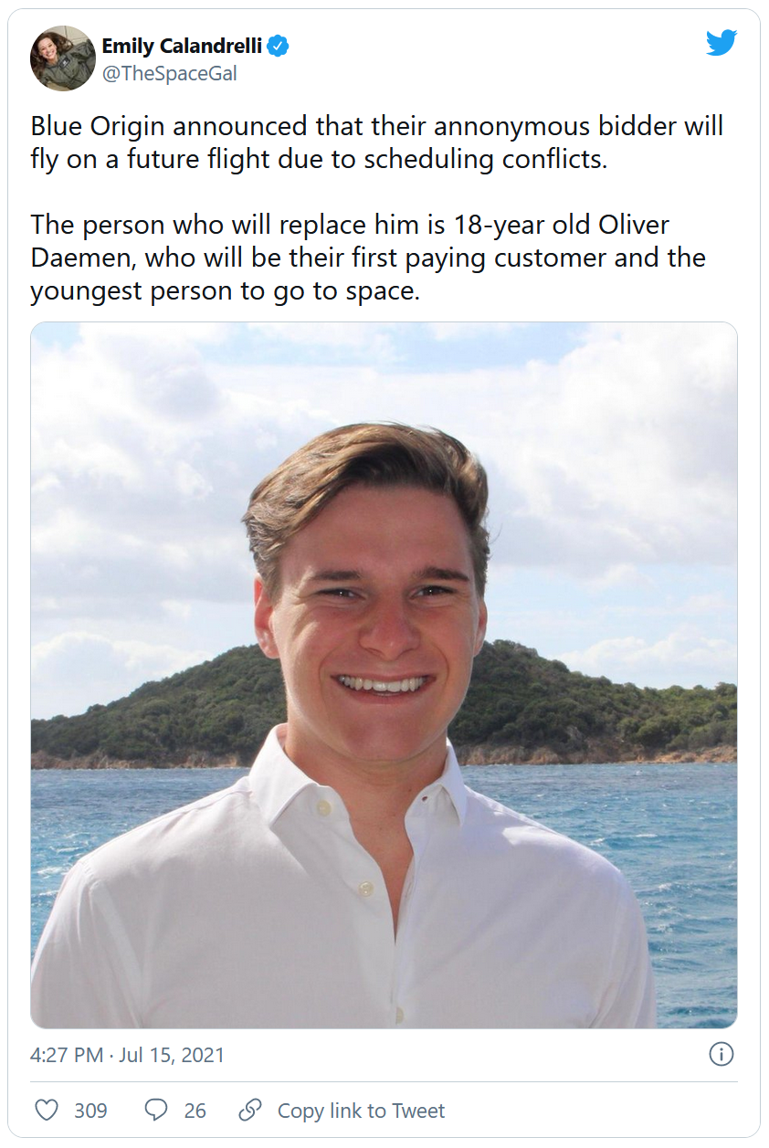 Blue Origin a annoncé que son enchérisseur anonyme volera sur un prochain vol en raison de conflits d'horaires. La personne qui le remplacera est Oliver Daemen, 18 ans, qui sera leur premier client payant et la plus jeune personne à aller dans l'espace.