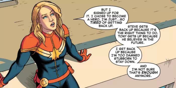 Mais ce sont dans les comics books que l'on apprend la véritable différence qui oppose nos deux amis, plus précisément dans le dernier numéro de Captain Marvel. Carol Danvers révèle ainsi pourquoi ces deux super-héros refusent à tout prix d'abandonner un combat. Ils ont leurs propres raisons de continuer à se battre. C'est dans le numéro #30 que la révélation a lieu, plus précisément lorsque Carol Danvers passe du temps avec Mme Marvel de Kamala Kahn et lui confie qu'elle se sent inefficace en tant que super-héroïne. Kamala Kahn la réconforte en lui montrant toutes les choses qui ont changé en bien depuis qu'elle est là. C'est là que Carol révèle des informations croustillantes sur ses collègues Captain America et Iron Man.