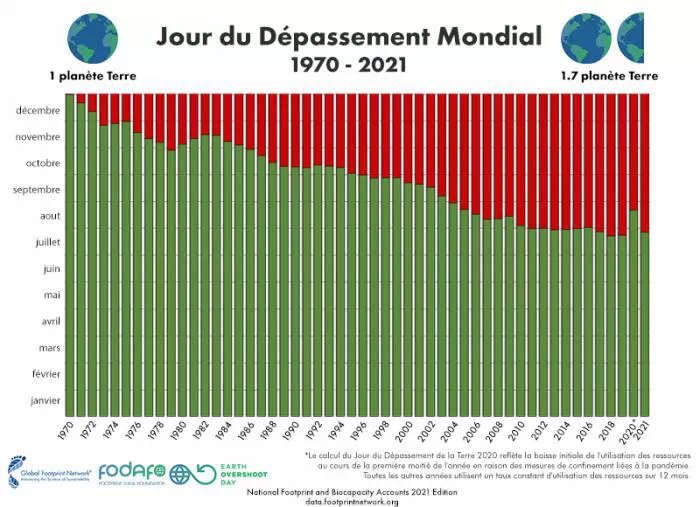 Les ressources de la Terre s'épuisent de plus en plus rapidement chaque année. L'ONG Global Footprint Network évalue annuellement le jour de dépassement des ressources biologiques de la planète Terre depuis 1970. Et le constat est très alarmant, puisque ce jour de dépassement a été évalué au 29 décembre au cours de l'année 1970. Cela signifie que les ressources étaient capable de couvrir la consommation de l'humanité durant presque toute l'année.
