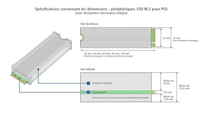 Longueur : les disques SSD M.2 des longueurs suivantes sont compatibles avec les consoles PS5 :