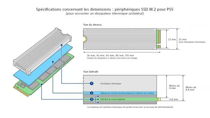 Bien évidemment, ces longues conditions n'arrivent pas seules. Ainsi, il faudra, qui plus est, savoir que "les disques SSD M.2 SATA ne sont pas pris en charge" et que "tous les jeux ne bénéficieront pas forcément des mêmes performances qu'avec le disque SSD interne ultra-rapide de la console PS5, même si la vitesse de lecture séquentielle du périphérique SSD M.2 est supérieure à 5 500 Mo/s". De plus, "la plupart des périphériques SSD M.2 présentant les numéros de type ci-dessus (2230, 2242, 2260, 2280 et 22110, type de clé M) ne disposant d'aucune structure de refroidissement intégrée logeront dans la fente SSD de la console PS5. Toutefois, les dimensions des structures de refroidissement (comme les dissipateurs thermiques) varient sensiblement".