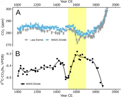 Conséquence : la population est passée de 60 millions à 5 millions d'individus en un siècle. Considérant qu'un Amérindien disposait d'une empreinte agricole d'environ un hectare, les chercheurs estiment que leur disparition a mené à la libération de 56 millions d'hectares, soit quasiment la superficie de la France. Cette situation a permis à la nature de reprendre ses droits et donc d'absorber plus de CO2. Les scientifiques démontrent dans leurs études que ce reboisement de l'Amérique aurait donc participé à la baisse de 47 à 67% de concentration de CO2 entre 1520 et 1610, entraînant ainsi un bouleversement thermique de la Terre.