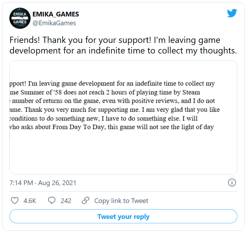 Et pour cause, face à ce problème, Emika Games n'a plus les fonds nécessaires pour financer son prochain jeu, From Day to Day, que des fans attendent déjà avec impatience. C'est dans un long message publié sur son compte Twitter que le développeur a fait part de son pépin :