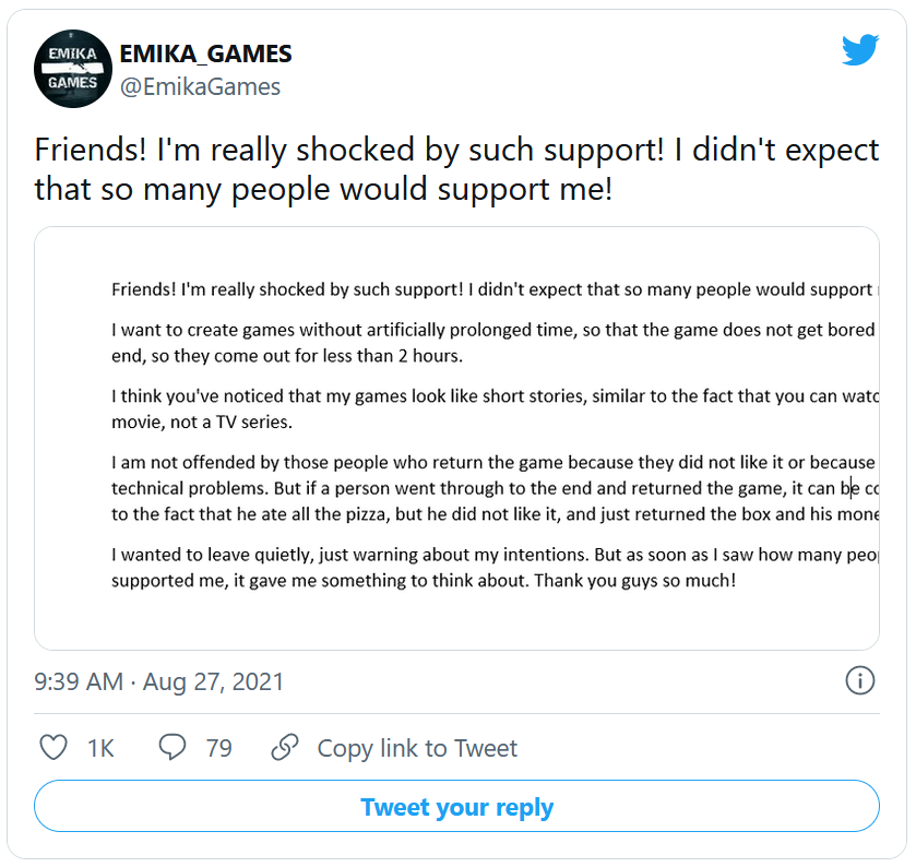 Des déboires qui ont par la suite été relayés par différents médias, dont Kotaku, portant de l'attention sur cette affaire. Et puisque Internet n'est pas qu'un repaire de joueurs se faisant rembourser un jeu qu'ils ont apprécié au dépend de son créateur, Emika Games a reçu un support bienvenu de la part de nombreux fans et de joueurs soucieux.