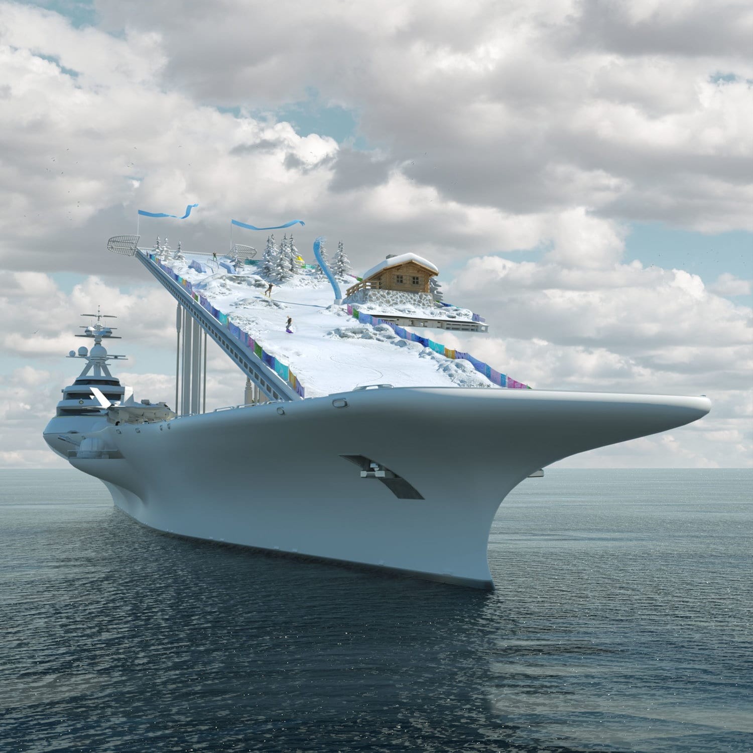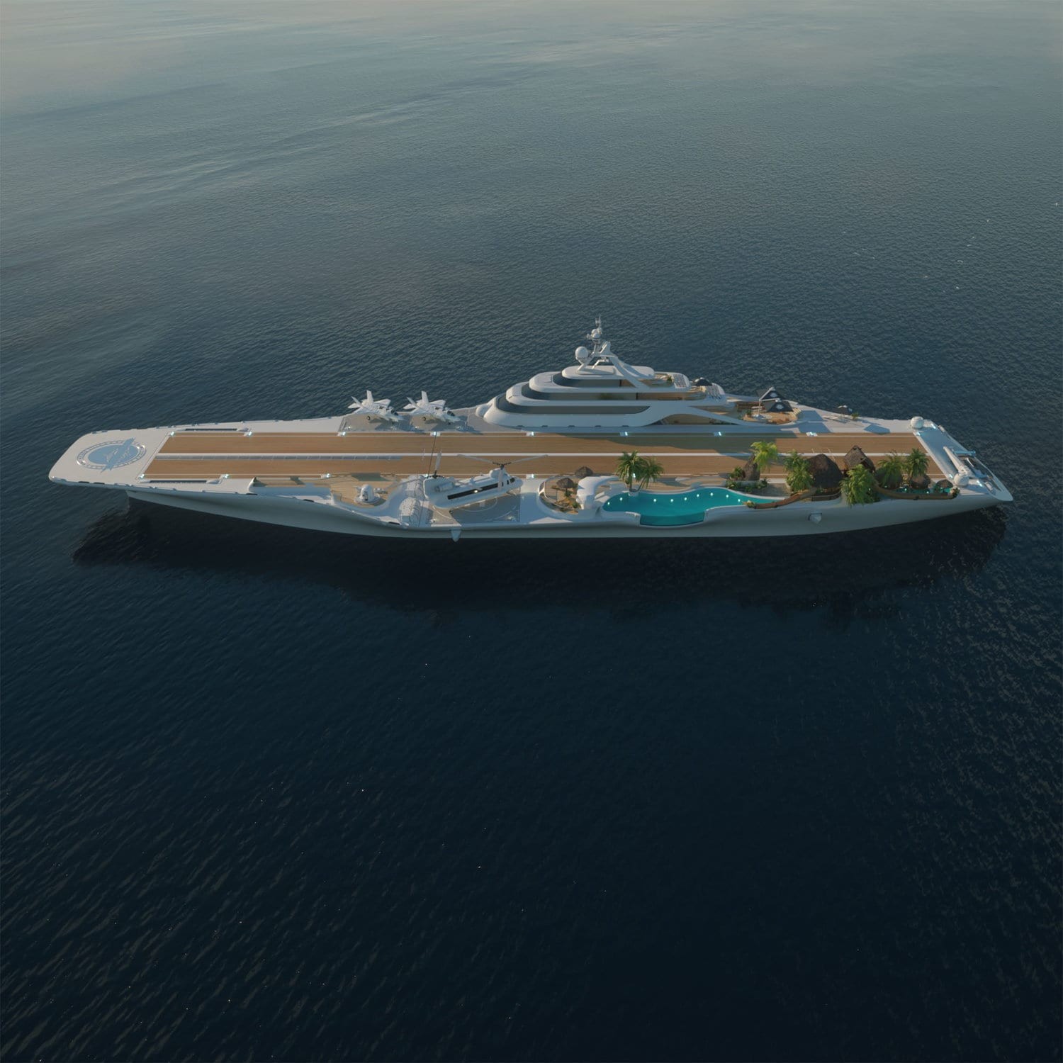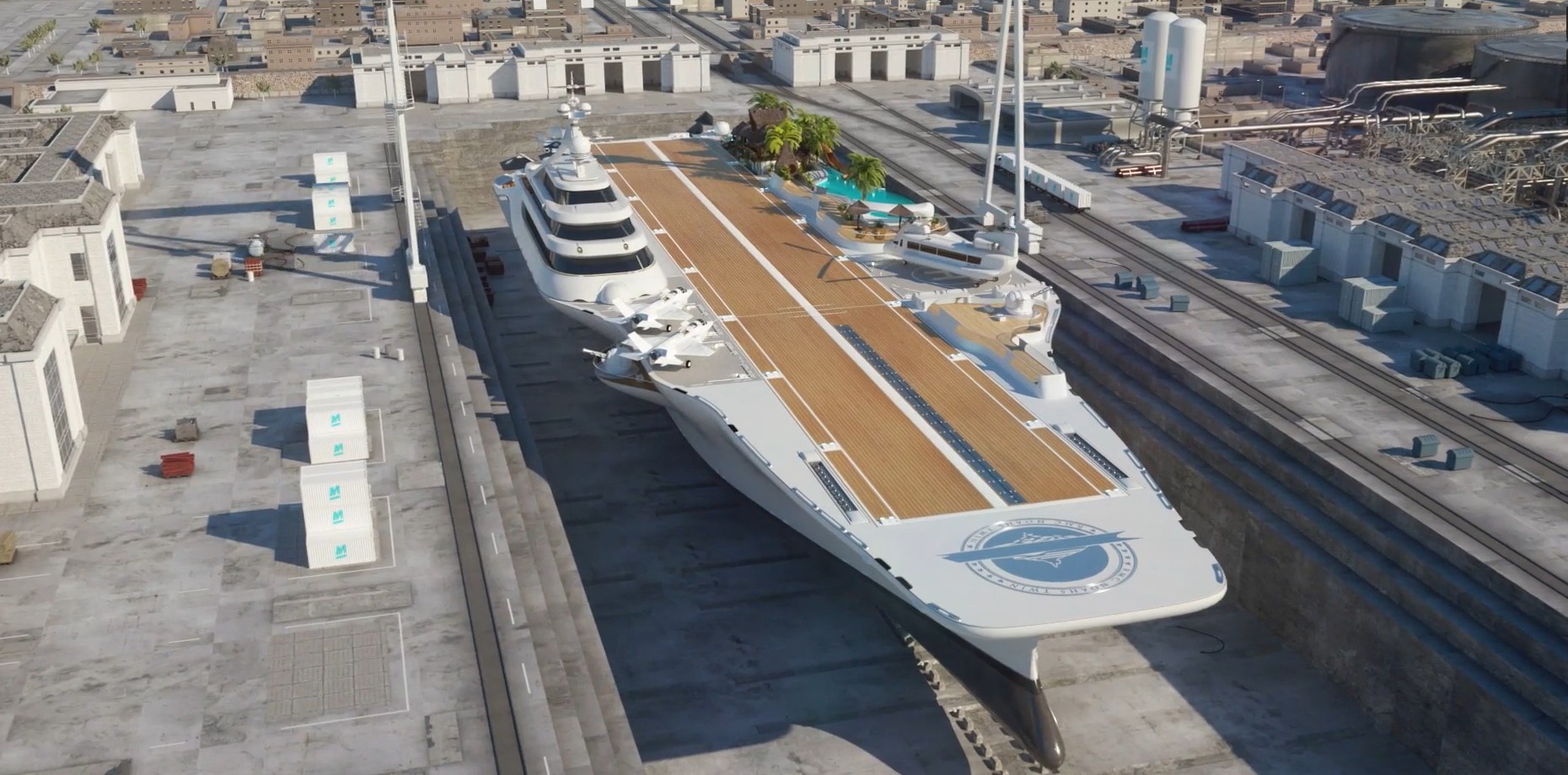 Un porte-avion-restaurant-golf. Dans le monde de la navigation de luxe où la démesure règne, ce navire de guerre de 265 mètres de long ferait en effet bonne figure. Pour s'en convaincre, il suffit de voir la projection numérique du navire réalisée par le studio de création néerlandais Mitsi.