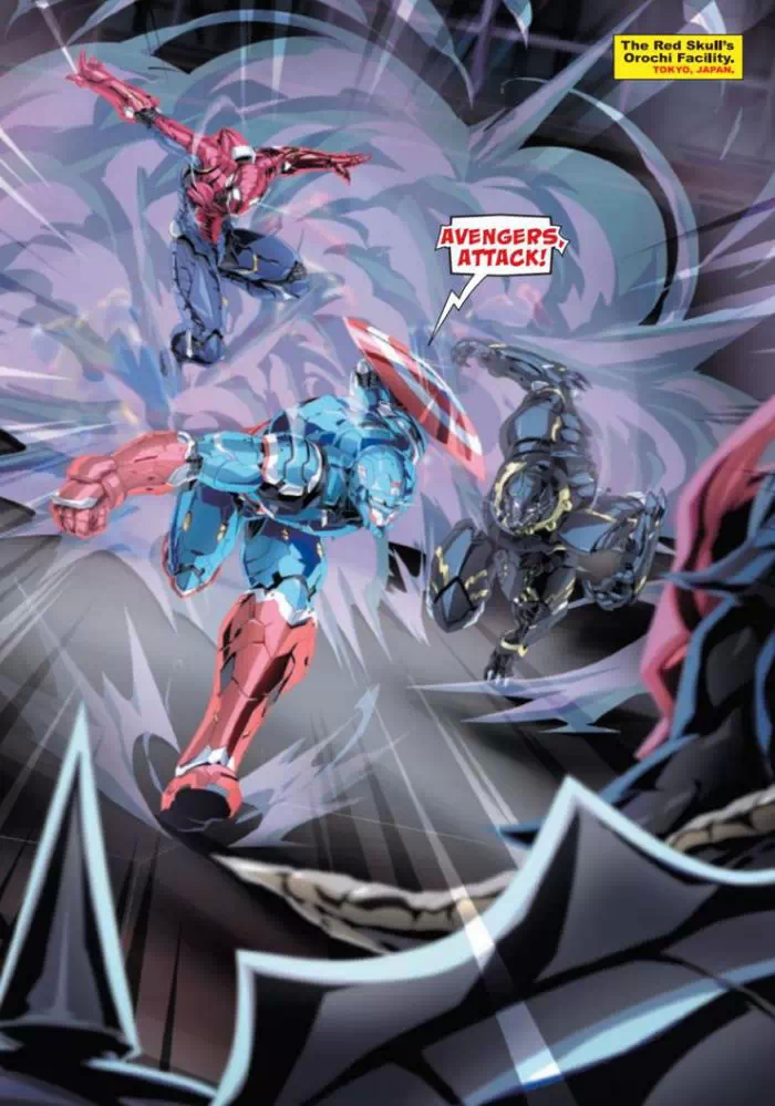 Ainsi, dans la série Tech-On Avengers #1, la Terre est menacée par Red Skull, alors doté de nouveaux pouvoirs. Par le biais d'une étrange source de pouvoirs, il est capable de vider les héros de leurs pouvoirs. Ainsi, Steve Rogers est dépossédé de sa force surhumaine et de sa plastique envié, résultats similaires chez Wolverine. Mais le X-Men voit cette nouvelle menace d'un autre œil, puisque parmi ses pouvoirs, on retrouvait ses capacités régénératives. Wolverine se meurt désormais, alors que le Peter Parker de cet univers doit affronter son environnement sans ses sens décuplés d'araignée.