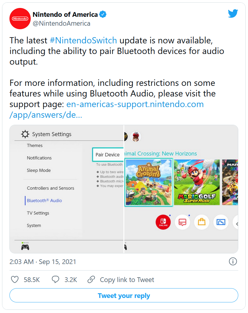 La dernière mise à jour #NintendoSwitch est maintenant disponible, comprenant la possibilité de coupler des appareils Bluetooth pour la sortie audio.