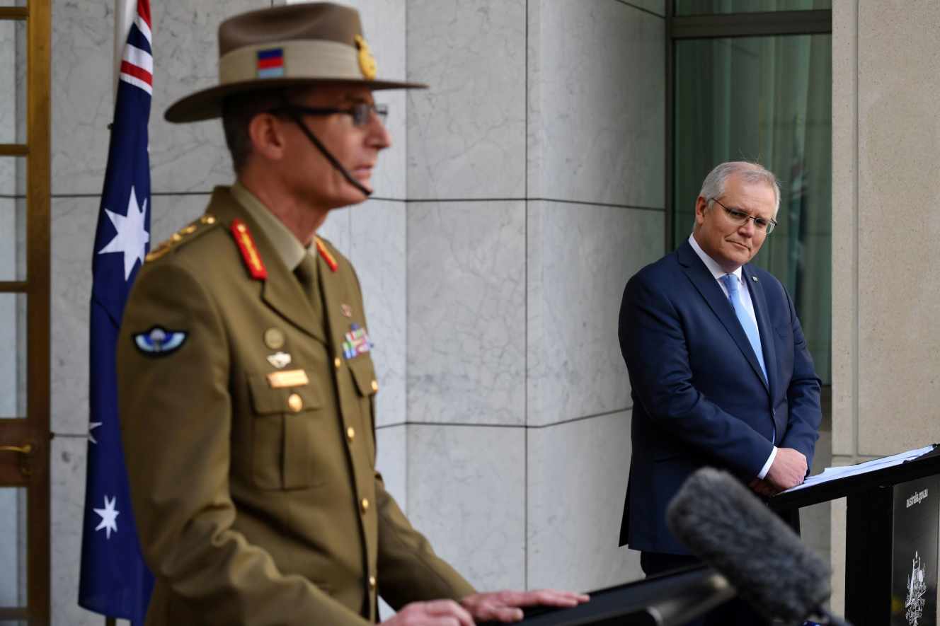 Le chef des forces de défense australiennes, le général Angus Campbell, et le premier ministre, Scott Morrison, lors d'une conférence de presse au Parlement à Canberra, en Australie, le 16 septembre 2021.