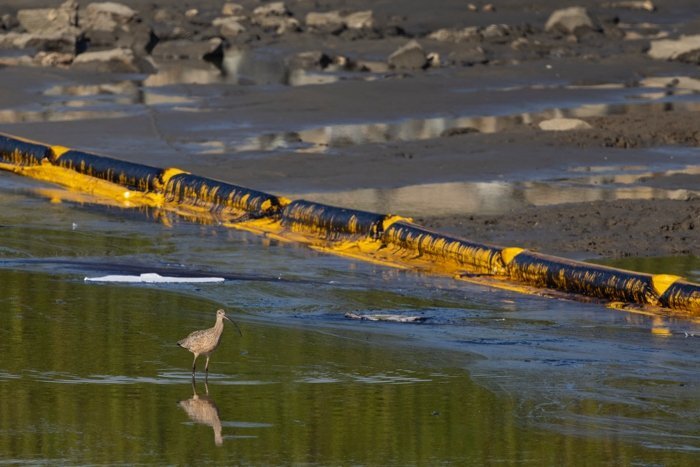Un courlis à long bec dans les eaux huileuses de Newport Beach, le 3 octobre 2021.