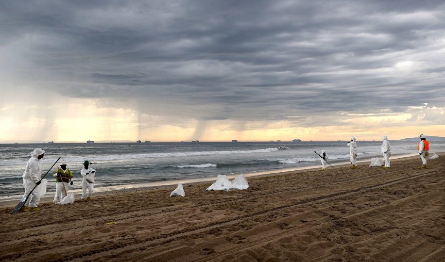 Peu de temps après le constat de ce que les autorités qualifient justement de « catastrophe environnementale », des oiseaux et des poissons ont commencé à s'échouer sur le rivage, alors qu'une nappe de 126 000 gallons de pétrole brut (soit environ 476 961 litres) étouffe les eaux au sud de Los Angeles, après s'être échappée d'un oléoduc endommagé relié à une plate-forme offshore.