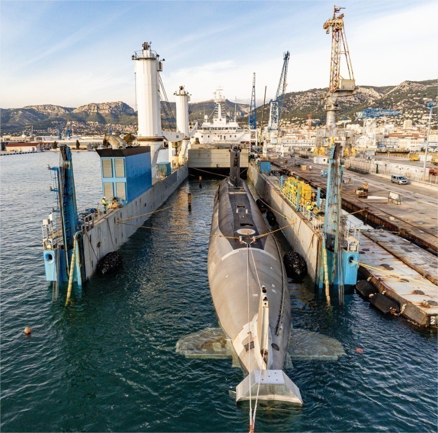 Le sous-marin nucléaire d'attaque Perle - ici lors de son embarquement sur le semi-submersible Rolldock Storm à Toulon (Var) - doit arriver vendredi 18 décembre 2020 à Cherbourg (Manche).