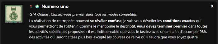 Et pour cause, même si ces activités ne sont pas forcément les plus populaires de GTA Online, elles ont le mérite de permettre aux joueurs de débloquer le trophée "Numero uno", qui consiste à se "classer premier dans tous les modes compétitifs". Malheureusement pour les chasseurs de trophées et les collectionneurs en herbe, les courses nautiques et les sauts en parachute y sont obligatoires. En enlevant lesdites activités de GTA Online, Rockstar empêche donc l'obtention de ce trophée, qui permet également d'obtenir le trophée Platine du jeu, qui nécessite de débloquer tous les trophées possibles au préalable.