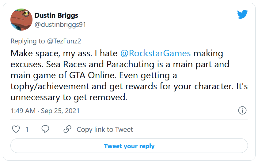 Faire de la place, mon cul. Je déteste quand Rockstar invente des excuses. Les courses nautiques et les sauts en parachute sont une partie majeure de GTA Online. Y compris obtenir un trophée et des récompenses pour votre personnage. Il n'est pas nécessaire de les supprimer.