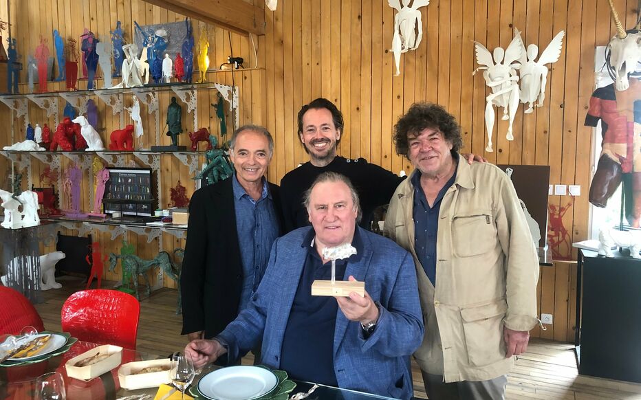 Gérard Depardieu (au c.) entouré de Jean-Maurice Belayche, directeur des Journées nationales du livre et du vin, Sébastien Forest, l'associé de Michel Audiard, et ce dernier, sculpteur des œuvres