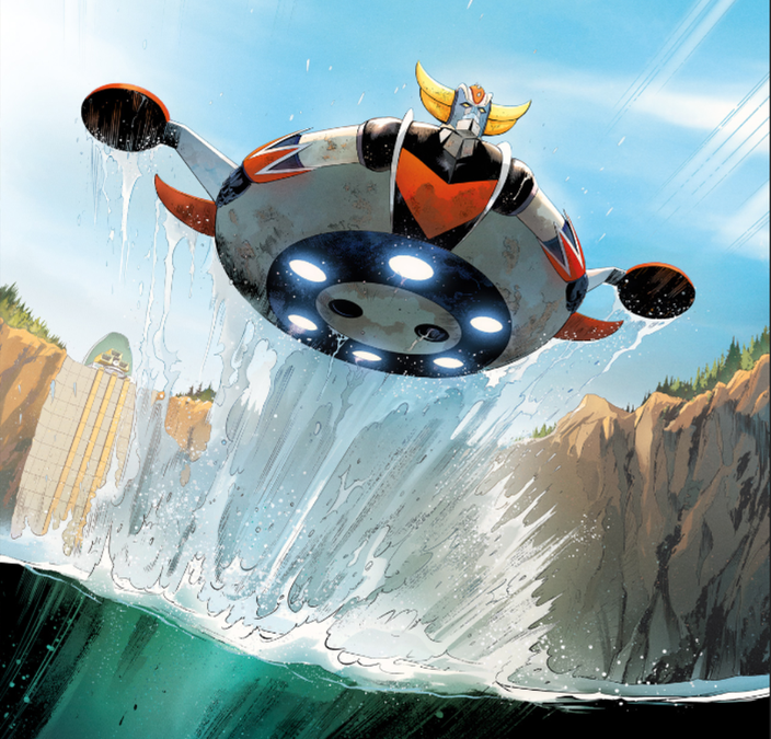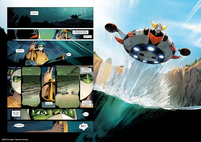 L'image suivante prend toute la page et montre Goldorak en majesté. «Il s'agit d'un jaillissement comme une seconde naissance, constate l'auteur. Nous montrons le robot surgir de l'eau sombre en contre-plongée pour montrer sa force et sa puissance. Il y a dans cette image une symbolique liée à la renaissance. Avec l'élément aqueux, il y a presque quelque chose d'amniotique.»