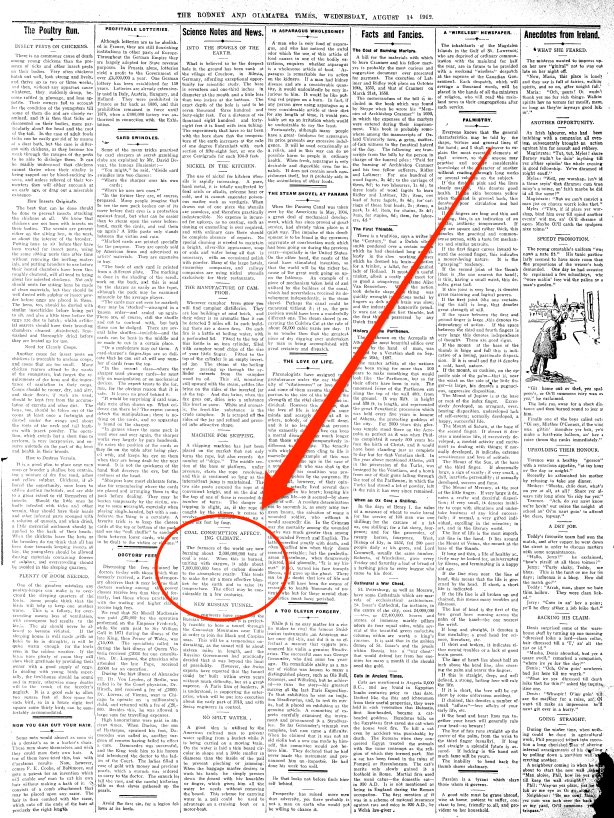 Il s'agit d'une explication étrangement claire de la manière dont les gens ont contribué au réchauffement de l'atmosphère terrestre. De plus, les Néo-Zélandais ne furent pas les premiers à écrire cela : le même texte avait été publié un mois plus tôt, le 17 juillet 1912, dans le journal australien Braidwood Dispatch. Et avant cela, une parution datant de mars 1912 de Popular Mechanics a été la première parution de ce texte.