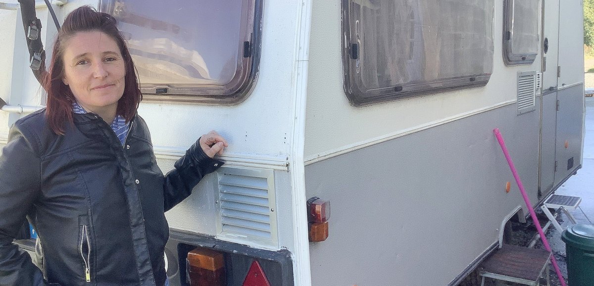 Aurélie Colin devant la caravane qu'elle habite à Argences avec Jérémy et leurs deux enfants, faute de pouvoir s'installer dans la maison dont le toit devait être réparé en début d'année. L'artisan qui a été payé pour faire les travaux pointe depuis aux abonnés absents.