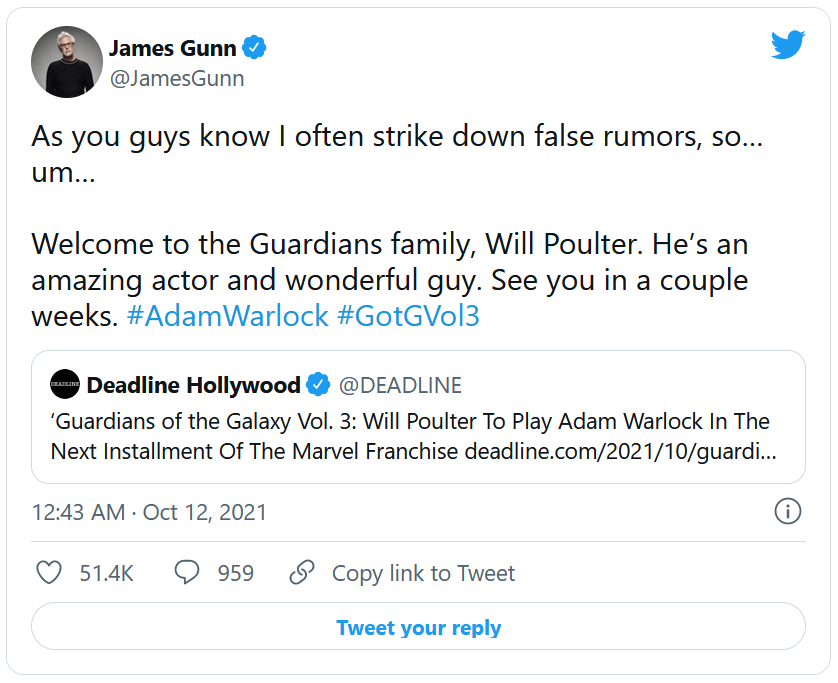 Voilà depuis plusieurs jours qu'une rumeur incessante court sur les réseaux sociaux : Will Poulter incarnerait très certainement le personnage de Adam Warlock dans Les Gardiens de la Galaxie vol. 3. Cette rumeur vient tout juste d'être confirmée par James Gunn au travers d'un tweet, que voici :