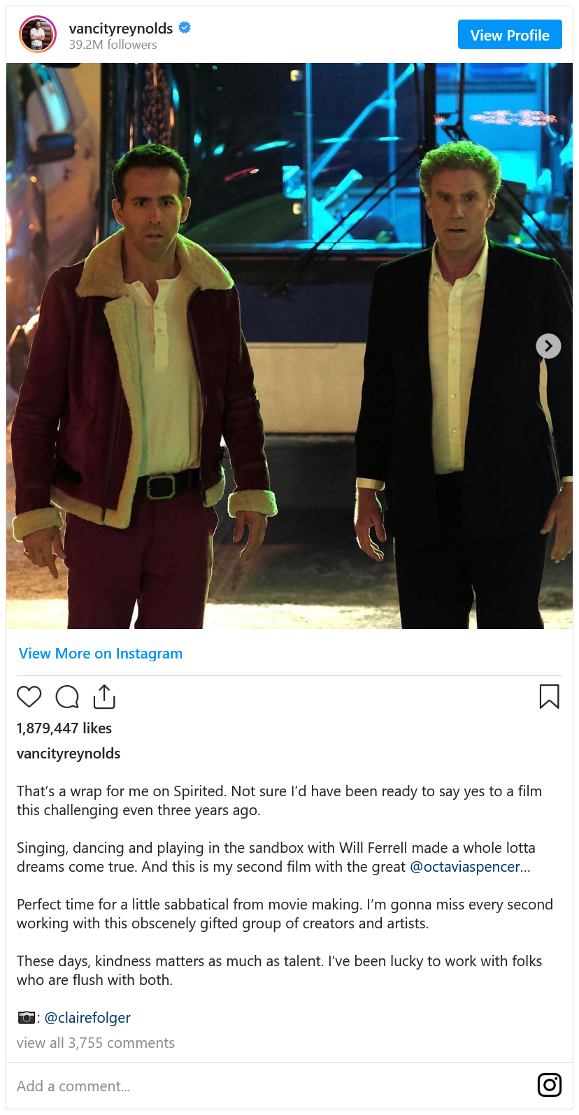 En effet, sur son compte Instagram, stupeur à la lecture du post de Ryan Reynolds : il se retire des plateaux de tournage hollywoodiens. Après avoir tourné Spirited, un film musical de Noël avec Will Ferrell et Octavia Spencer, l'interprète de Deadpool a pris la décision de s'accorder un congé sabbatique d'une durée indéterminée.
