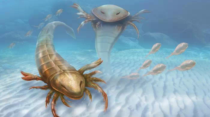 Ce spécimen est un euryptéride, un groupe d'arthropodes qui a disparu à la fin du Permien. Ce nouveau membre baptisé Terropterus xiushanensis vient d'être découvert en Chine. Très impressionnant, le fossile montre que certains de ses membres pouvaient faire la taille d'un être humain et pour les plus petits, celle d'une main.