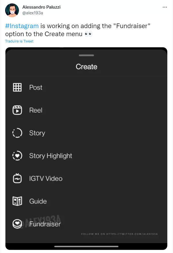 Instagram commencera bientôt à tester une nouvelle façon de créer des collectes de fonds pour les organisations à but non lucratif, avec l'introduction d'une fonctionnalité permettant de lancer la collecte de fonds directement à partir du bouton de création (le bouton " + "). Lorsque vous appuyez sur cette option, au lieu de sélectionner Post, Story, Reels ou Live, vous verrez une option permettant de sélectionner une organisation à but non lucratif et ainsi ajouter la collecte de fonds à votre Feed.