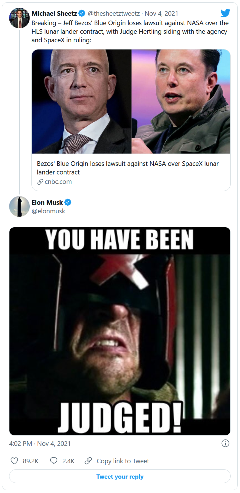 Si l'on se doutait qu'Elon Musk serait très attentif au verdict de la Cour Fédérale des Réclamations, on imaginait cependant pas qu'il réagirait de la façon qu'il a réagi : en effet, sur Twitter, le fondateur de SpaceX, qui a récemment annoncé vouloir donner une somme astronomique pour lutter contre la faim dans le monde, a ouvertement raillé la défaite de Jeff Bezos et de Blue Origin, en publiant en commentaire d'une réaction du journaliste Michael Sheetz faisant état de la défaite de Bezos, un meme tiré du film Judge Dredd de Danny Cannon, sorti en 1995, et tiré du comics britannique éponyme de John Wagner. Un même particulièrement à propos, puisque le personnage déclare : "You have been judge !" (en français, "Tu es jugé !")