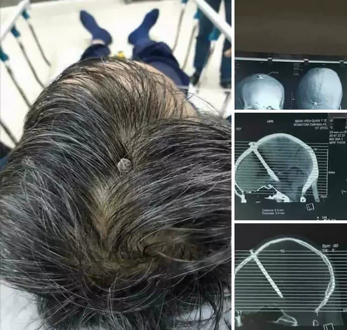 Vu Van Tho, âgé de 60 ans, s'est enfoncé un clou dans le crâne, qui a transpercé son cerveau. Heureusement pour lui, la pointe métallique n'a pas endommagé de parties vitales. Le patient a attendu 48 heures avant de se rendre aux urgences, puisqu'il avait totalement oublié comment s'était produit l'accident (et ne se rappelait même plus avoir un clou dans le crâne).