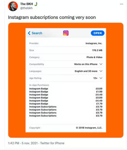 Les choses semblent se concrétiser davantage aujourd'hui. Selon le site spécialisé TechCrunch, le réseau social pourrait lancer très prochainement ses abonnements payants. En effet, Instagram aurait ajouté à son application américaine plusieurs nouvelles options d'achats intégrés depuis le début du mois de novembre sur l'App Store. Deux pour être précis : une première de 0,99 $, et une seconde à 4,99 $, soit des références à ces abonnements payants. Si ces changements ne sont visibles que sur l'app store américain, cela annonce tout de même de futurs changements à l'international.