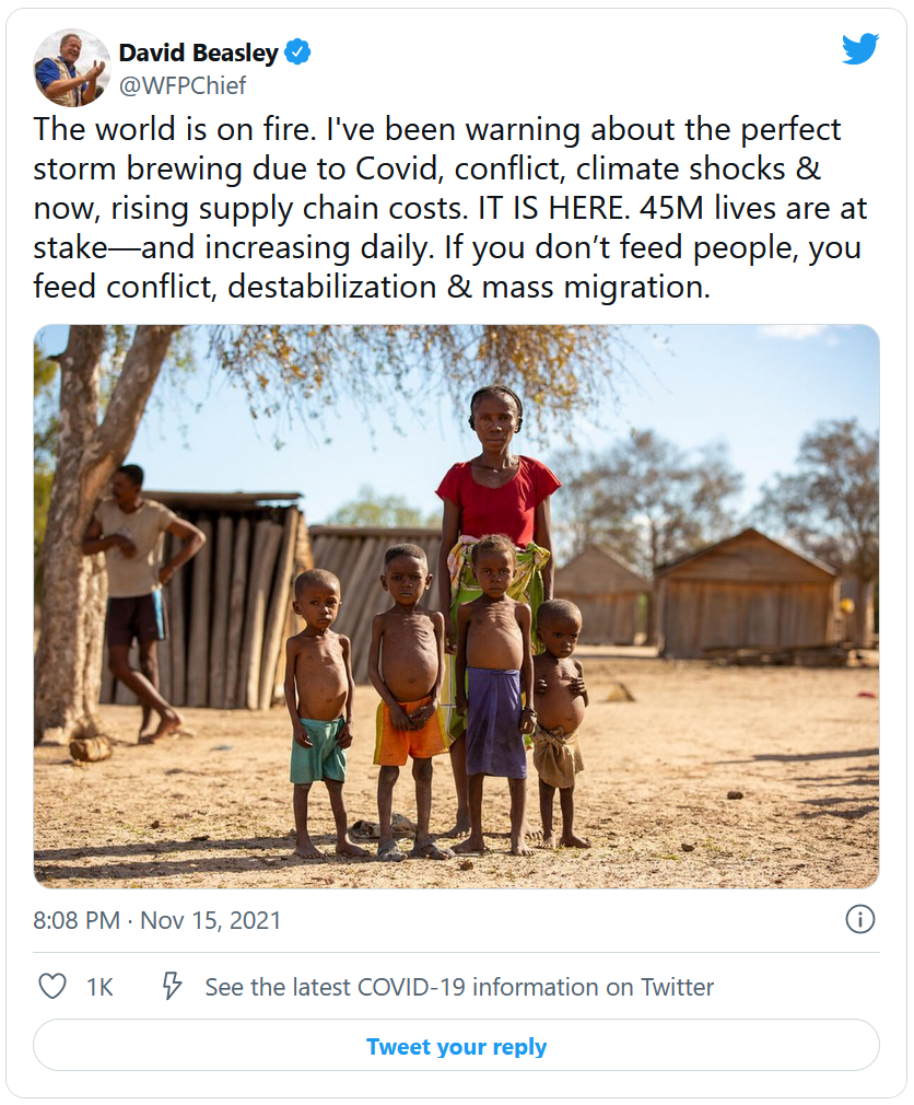 Sur le réseau social au petit oiseau bleu, Elon Musk avait mis au défi l'Organisation des Nations Unies de lui prouver en quoi six milliards de dollars pourrait concrètement aider à lutter contre le problème de la faim dans le monde. Il avait également promis que si la PAM, une branche de l'ONU dédiée aux problèmes alimentaires, lui répondait de manière pertinente, il lui verserait la somme en question en revendant des actions Tesla. Le tout faisait suite à une interview lors de laquelle David Beasley, directeur exécutif du Programme Alimentaire Mondial (PAM), soutenait que 2% de la richesse du milliardaire pourrait permettre de régler le problème de la faim dans le monde.